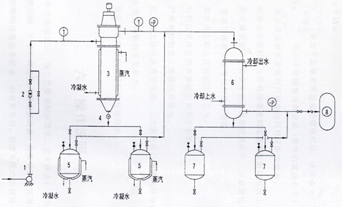 1 進料泵 2 流量計 3 薄膜蒸發(fā)器 4 視鏡 5 濃縮液接受罐 6 冷凝器 7 冷凝液接受罐 8 真空泵